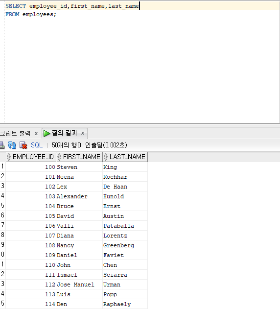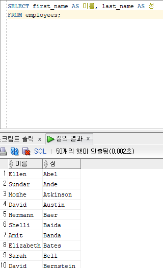 column명이 연결연산자로 연결될때는 first_name||last_name이런식으로 나오는게 보기싫어서 별칭까지 만들어 주었다.