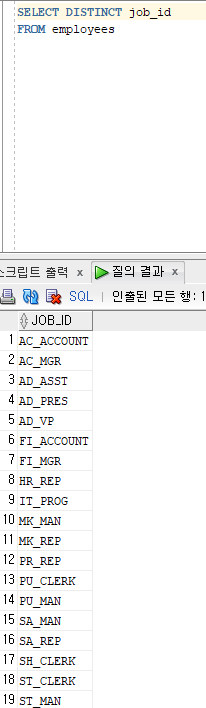 테이블 내의 전체 employee 수가 107명인데 DISTINCT로 19개의 job_id만 가져올 수 있었다.