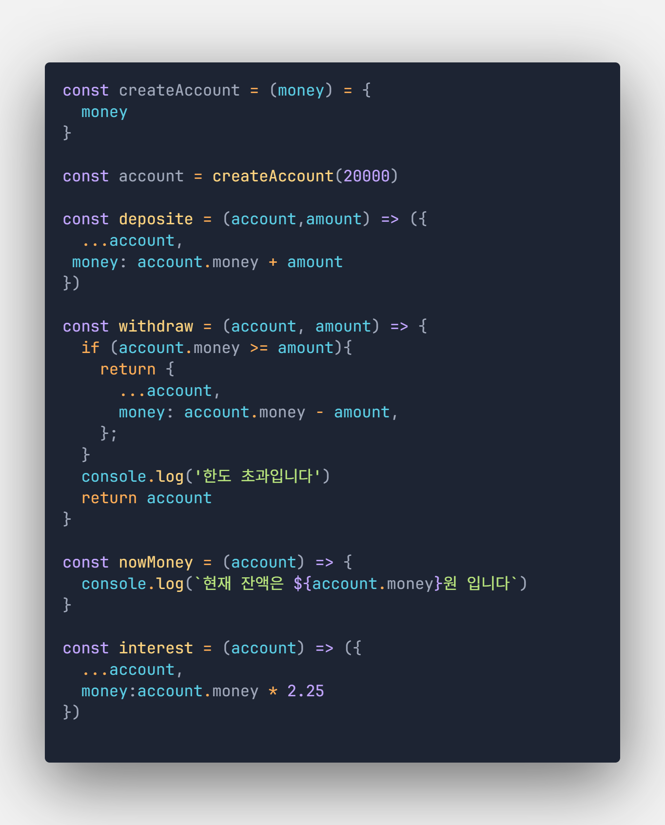 앞선 은행계좌 예시로 객체지향형 프로그래밍을 정리하자면 아래와 같이 사용할 수 있습니다.