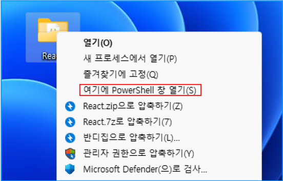 1. shift + 우클릭으로 리액트파일로 만들 폴더를 선택