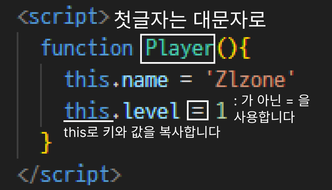 2. function으로 만들고 이름 앞글자는 영 대문자로 적어주는게 관습이다. 그리고 : 대신 = 을 쓰고 this를 사용해 인스턴스를 생성해 주어야 한다.